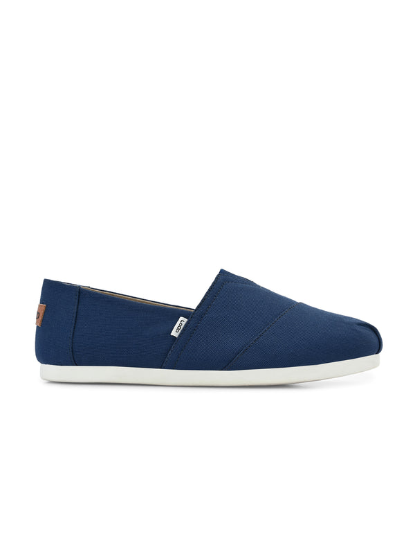 - Deep navy canvas upper with a smooth matte texture
